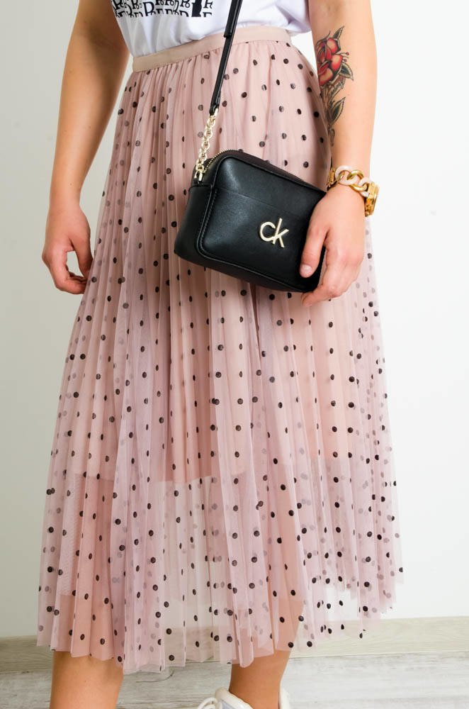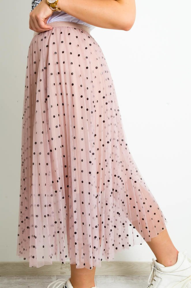 RÓŻOWA PLISOWANA SPÓDNICA MIDI Z TIULU W CZARNE KROPKI