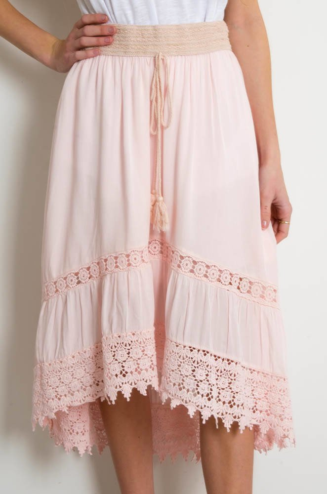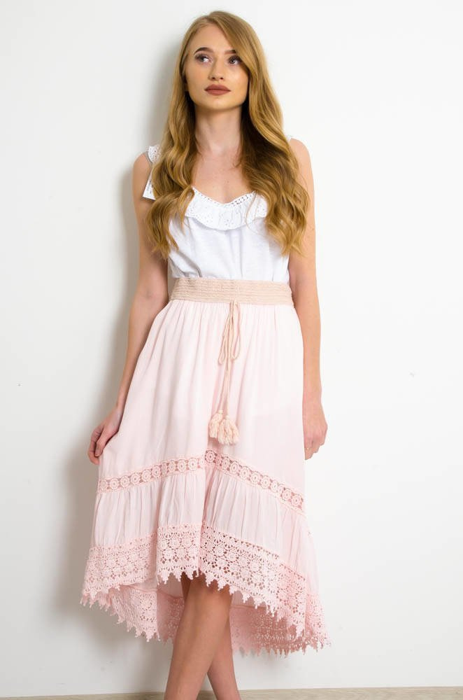 SPÓDNICA MIDI Z GUMĄ W PASIE ORAZ AŻUROWYM WYKOŃCZENIEM-JASNY RÓŻ