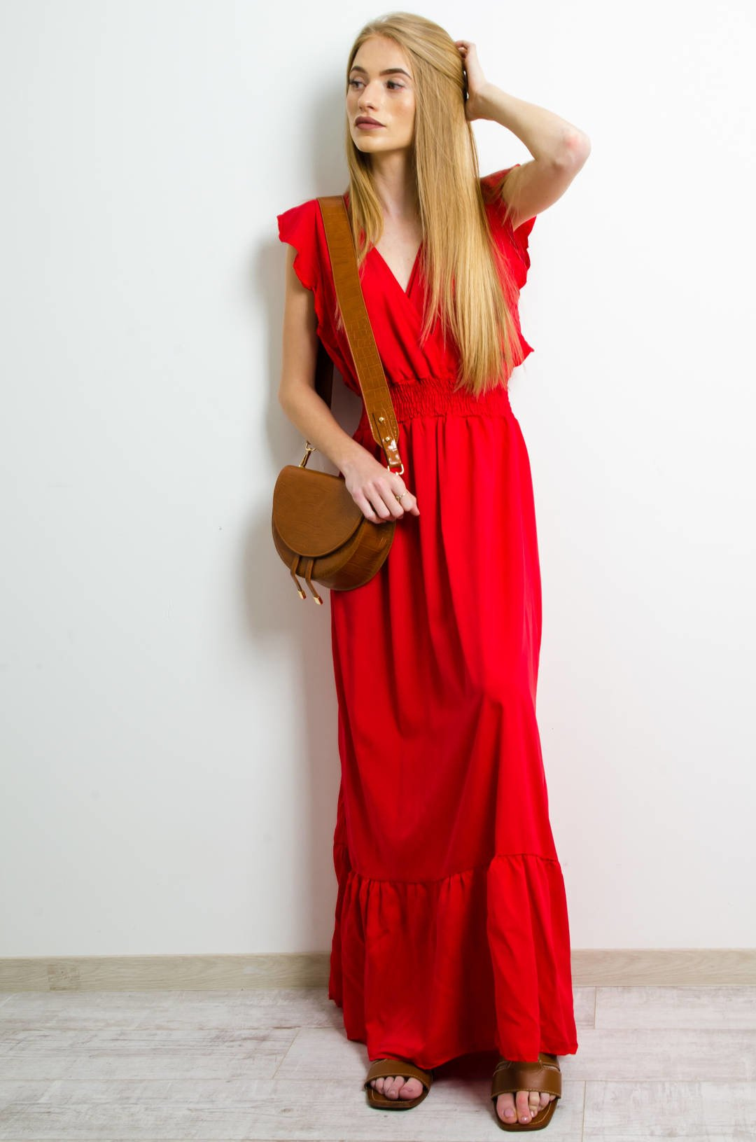 DŁUGA CZERWONA SUKIENKA Z KOPERTOWYM DEKOLTEM