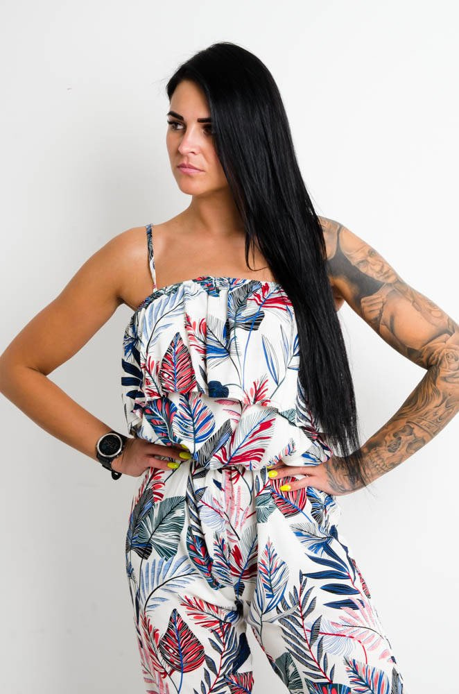 BIAŁY KOMBINEZON W KWIATY Z HISZPAŃSKIM DEKOLTEM