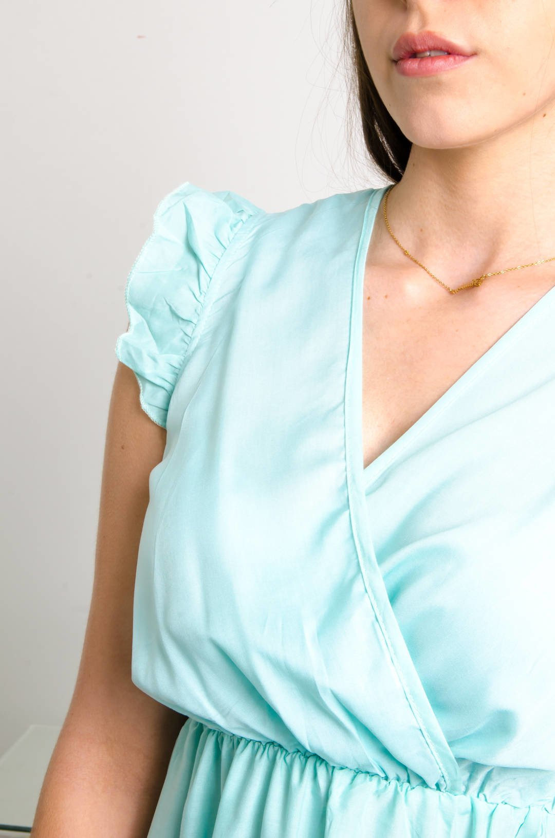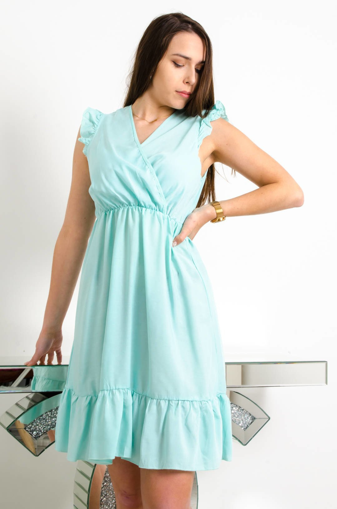 NIEBIESKA KRÓTKA ZWIEWNA SUKIENKA Z KOPERTOWYM DEKOLTEM