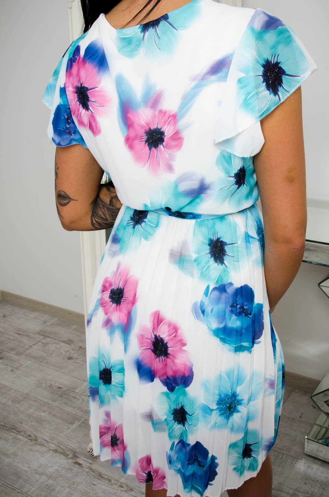 BIAŁA SUKIENKA W NIEBIESKO-ZIELONE KWIATY