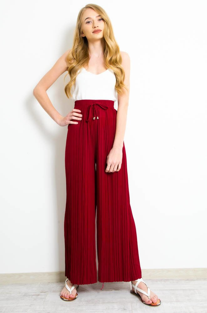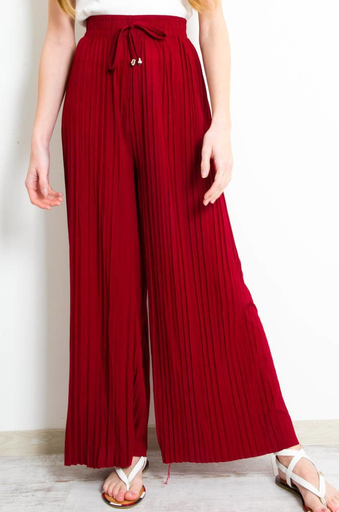 BORDOWE SPODNIE Z SZEROKIMI PLISOWANYMI NOGAWKAMI-WYSOKI STAN