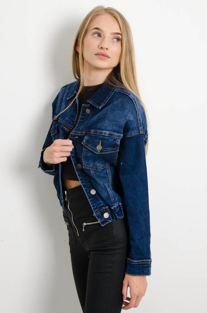 GRANATOWA KURTKA JEANSOWA BOMBERKA ZE ŚCIĄGACZEM