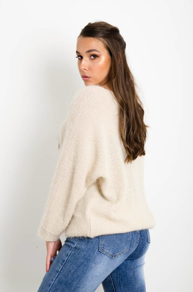 BEŻOWY SWETER NIETOPERZ Z DEKOLTEM W SZPIC.