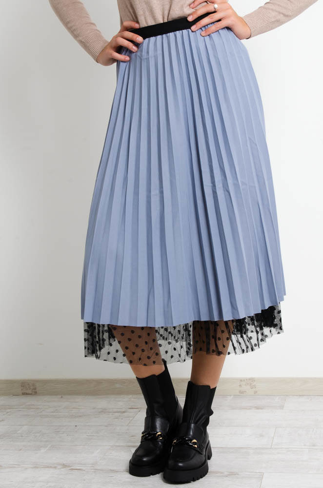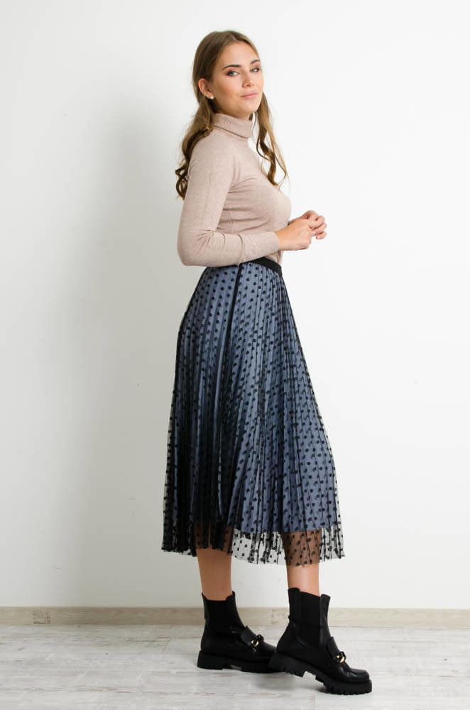 SZARA PLISOWANA SPÓDNICA MIDI Z TIULU W CZARNE KROPKI