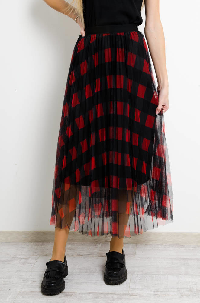 CZERWONA SPÓDNICA TIULOWA W KRATĘ