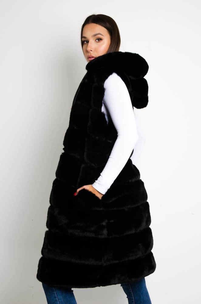 DŁUGA CZARNA FUTRZANA KAMIZELKA Z KAPTUREM