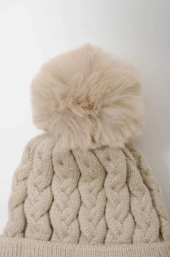 BEŻOWA ZIMOWA CZAPKA PLECIONA Z POMPONEM