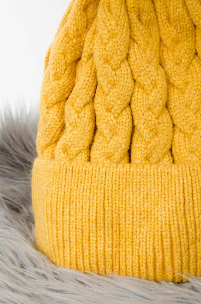 MUSZTARDOWA ZIMOWA CZAPKA PLECIONA Z POMPONEM