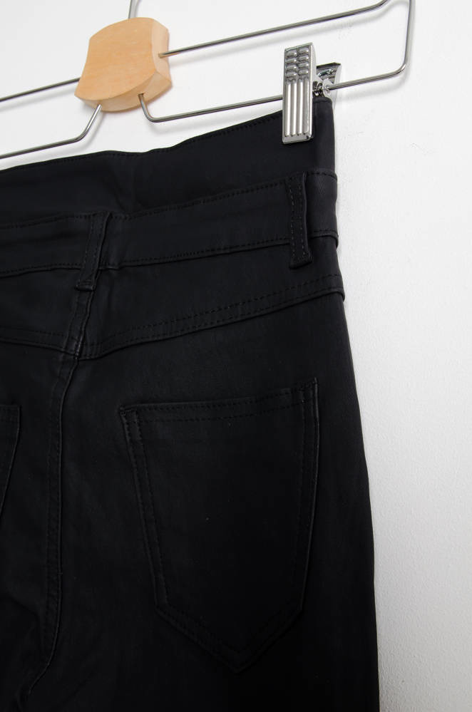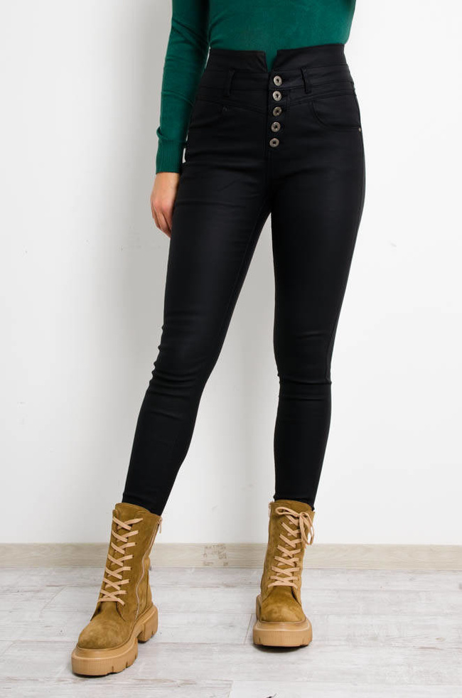 Spodnie woskowane z funkcją modelowania, trzymają i podkreślają talię, uda i pośladki oraz zachowują kształt. Wysoki stan, rozporek na guziki. Obcisłe nogawki.