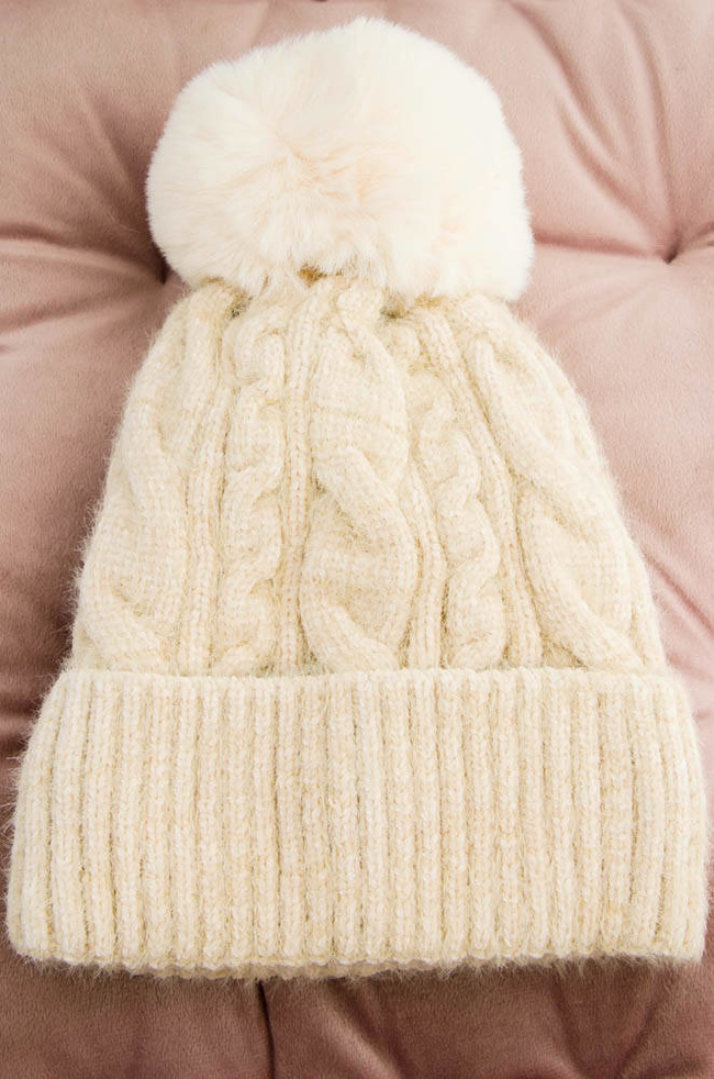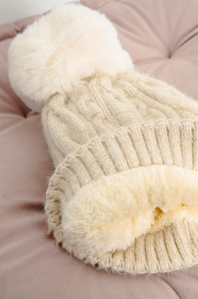 BEŻOWA OCIEPLANA CZAPKA Z POMPONEM