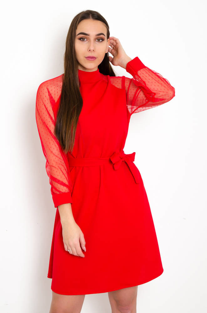 CZERWONA SUKIENKA Z KORONKOWYMI RĘKAWAMI