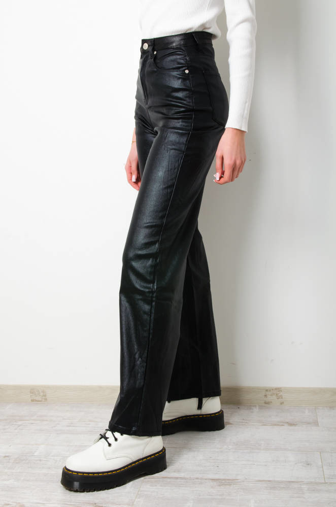 Spodnie z imitacji skóry. Wysoki stan, rozporek zapinany na suwak i guzik. Rozszerzane nogawki.