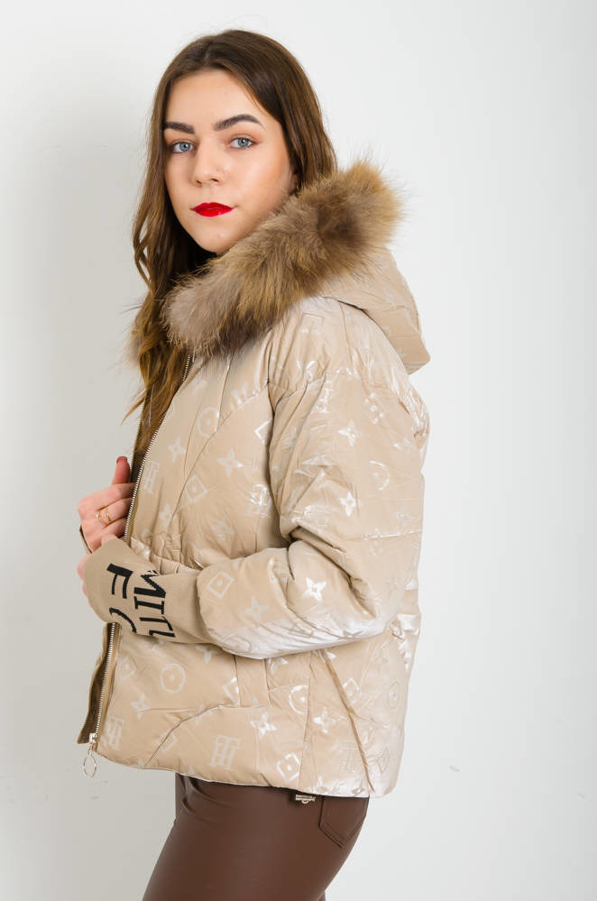 BEŻOWA PUCHOWA KURTKA WE WZORY LOUIS POŁYSKUJACA