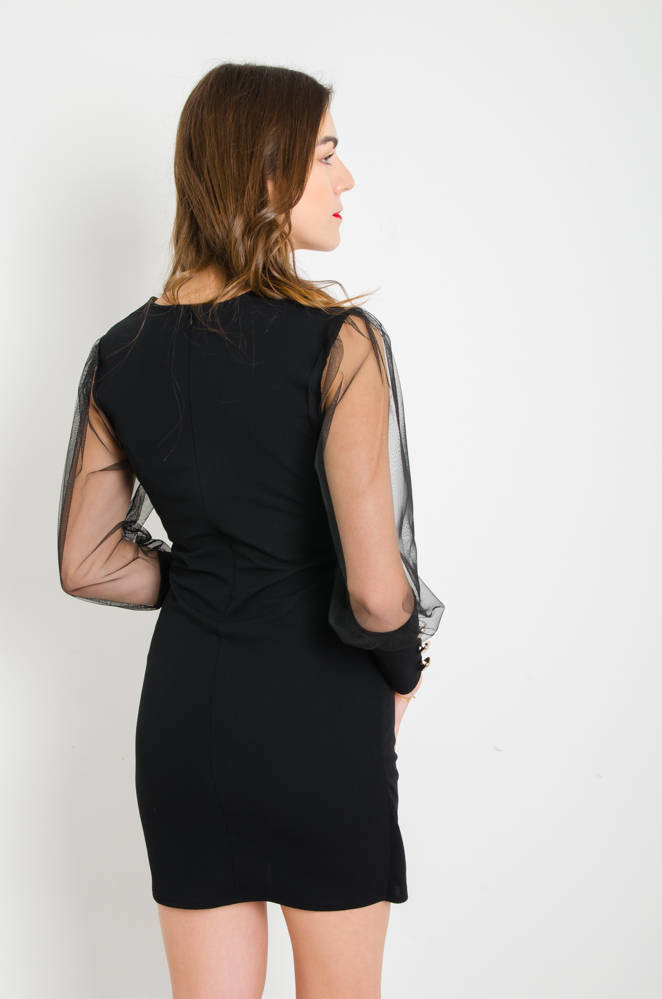 CZARNA KOPERTOWA SUKIENKA Z TIULOWYMI RĘKAWAMI