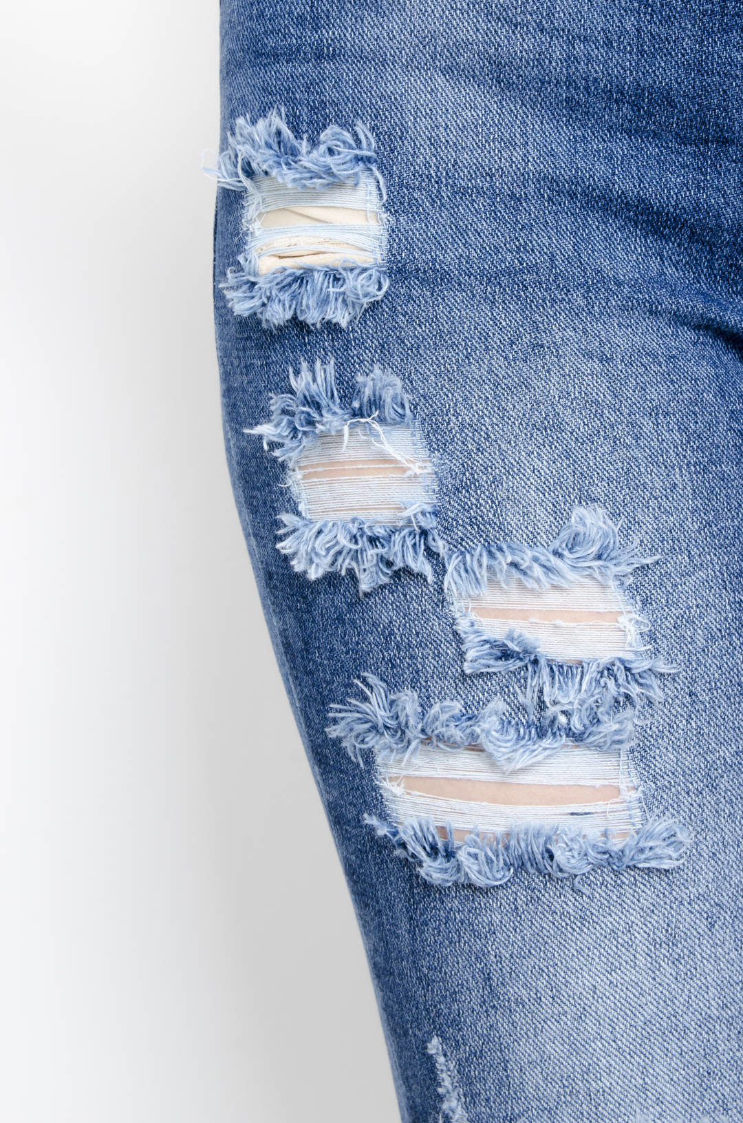 Jeansy z funkcją stretchu, który trzyma i modeluje talię, uda i pośladki oraz zachowuje kształt jeansów. Wysoki stan, rozporek na guziki. Obcisłe nogawki z dziurami i przetarciami..
