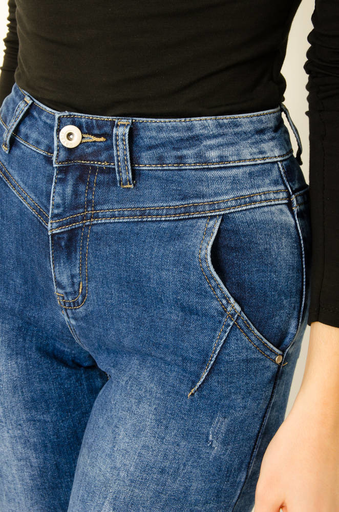Jeansy z lekko elastycznego denimu z wysokim stanem. Dopasowująca się guma w pasie, rozporek zapinany na guzik i i suwak. Nieco luźniejszy fason, zwężane nogawki do kostki z przetarciami.