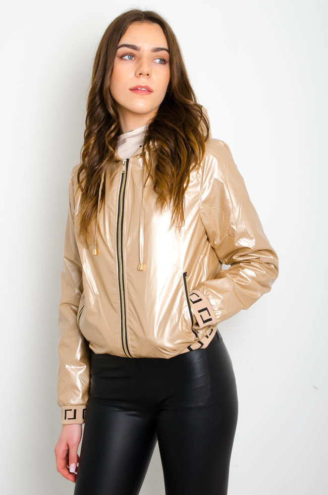 BEŻOWA POŁYSKUJĄCA KURTKA WIOSENNA Z KAPTUREM