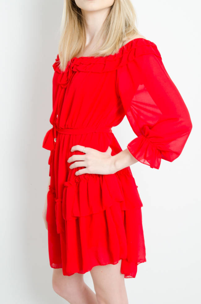 SUKIENKA SZYFONOWA  Z HISZPAŃSKIM DEKOLTEM CZERWONA