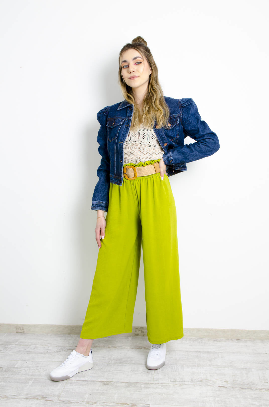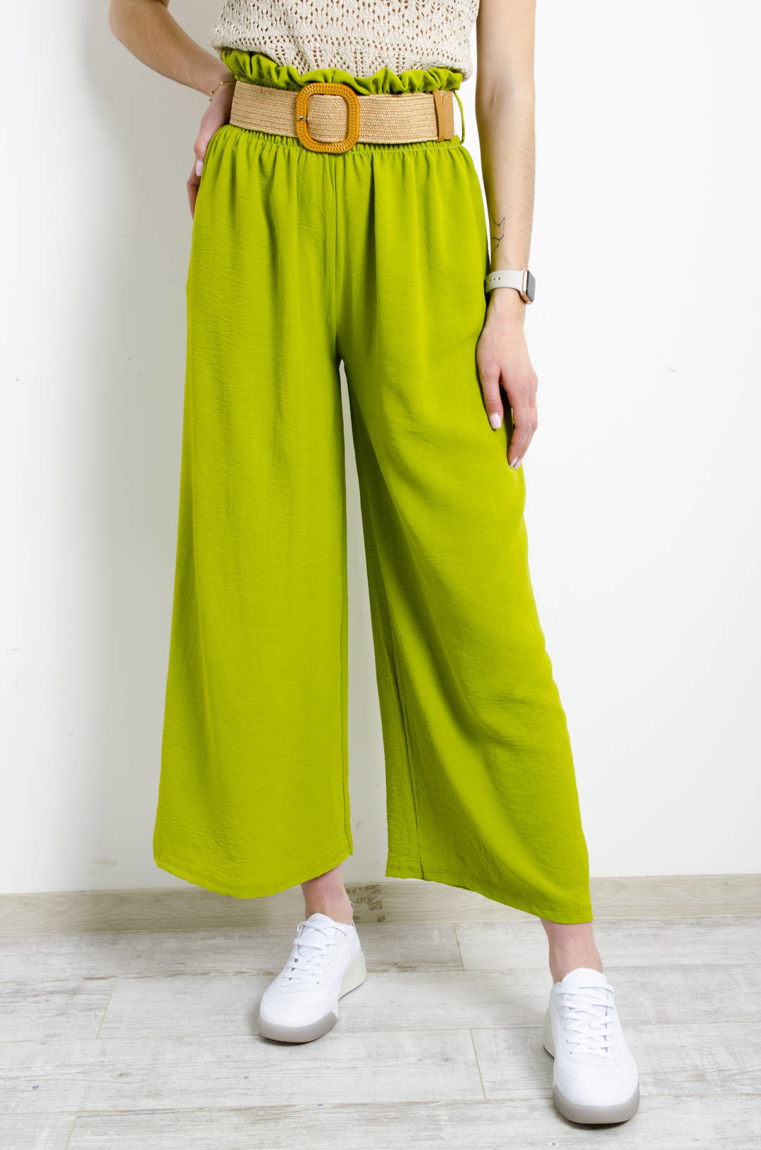 SPODNIE MATERIAŁOWE Z MARSZCZONĄ GUMĄ W PASIE I PLECIONYM PASKIEM- ZIELONE