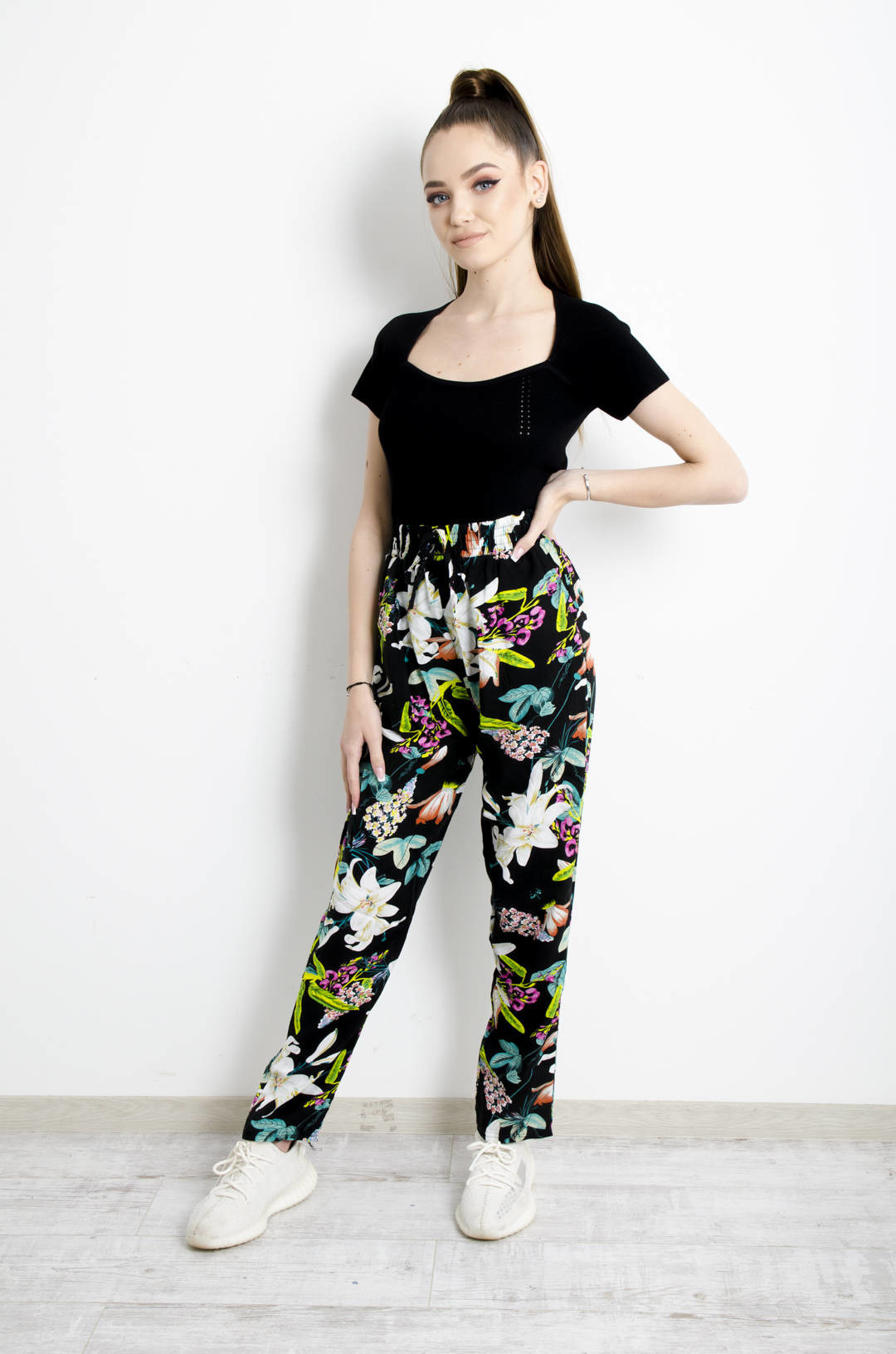 CZARNE ALLADYNKI W KWIATY Z WYSOKIM STANEM