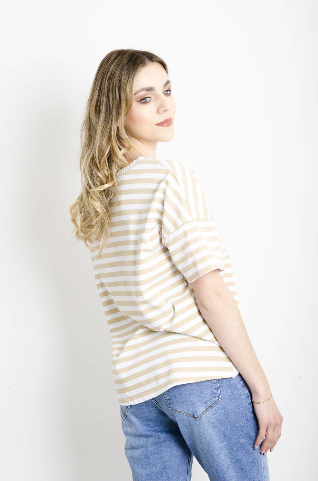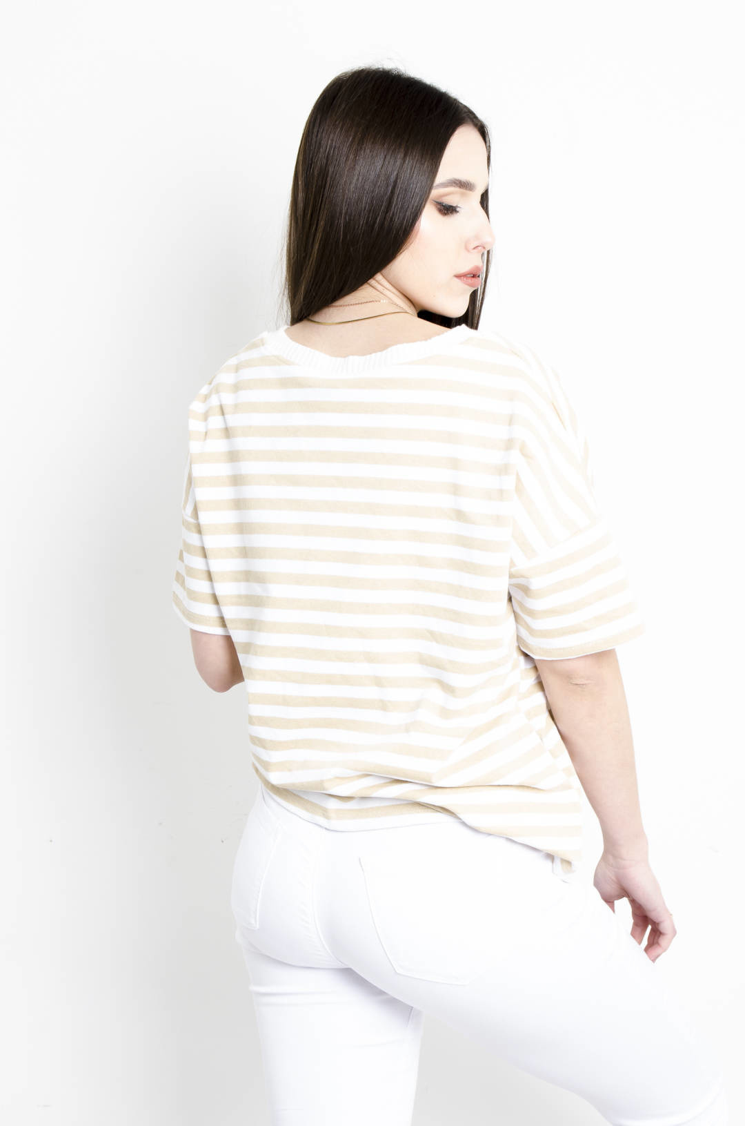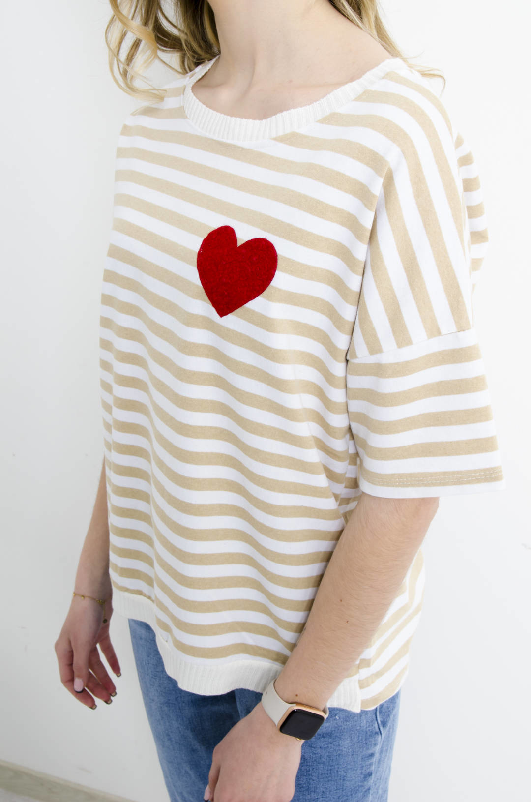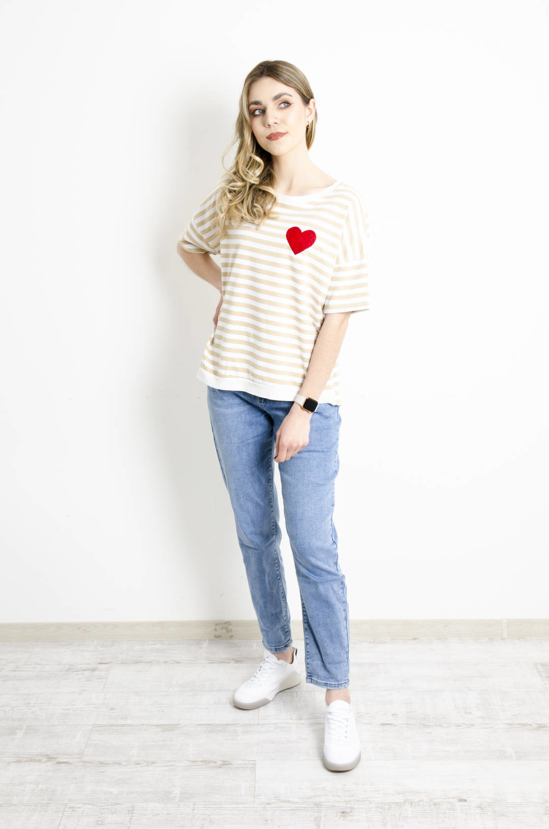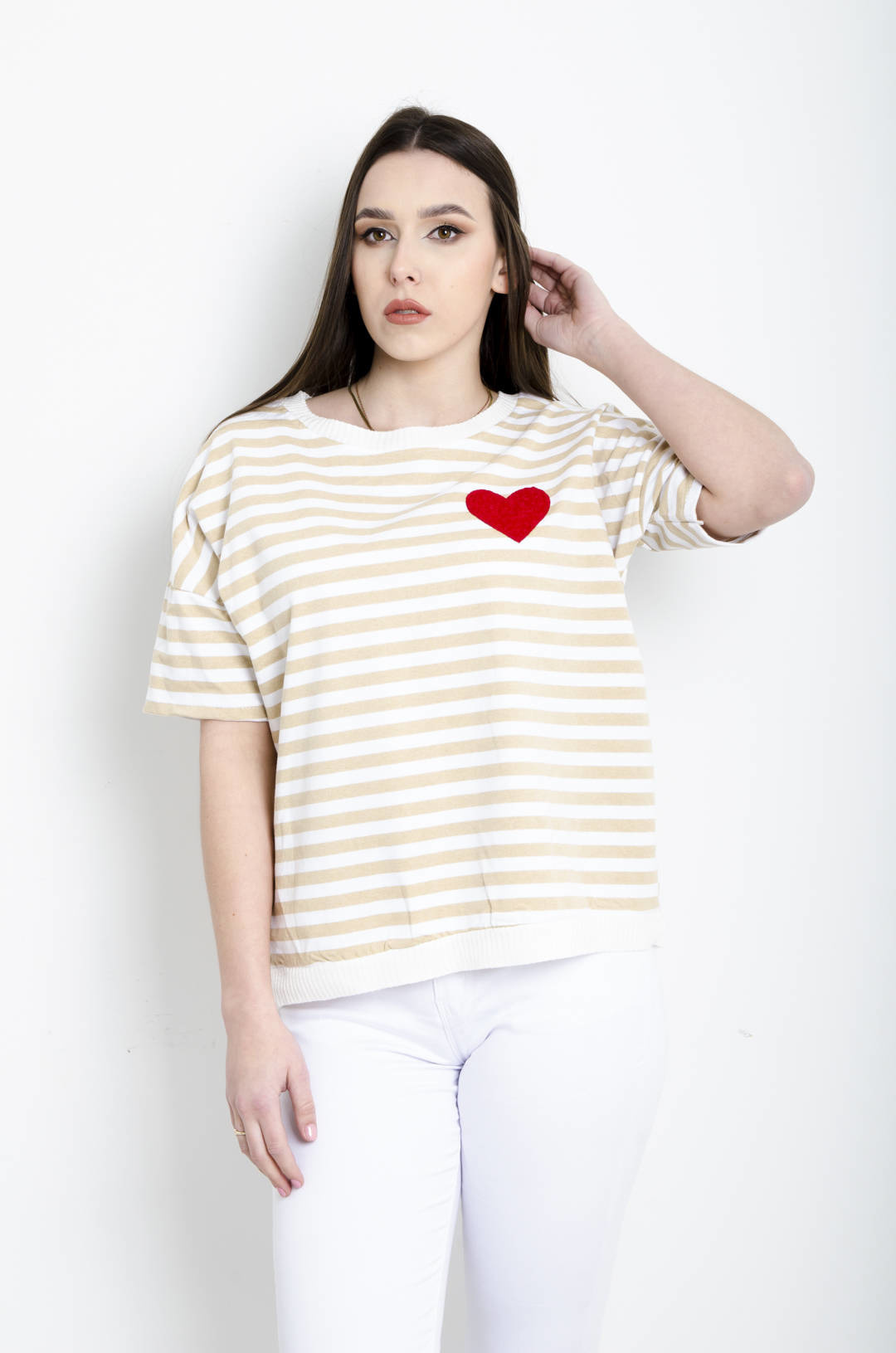 T-SHIRT BIAŁO-BEŻOWY W PASKI Z SERDUSZKIEM