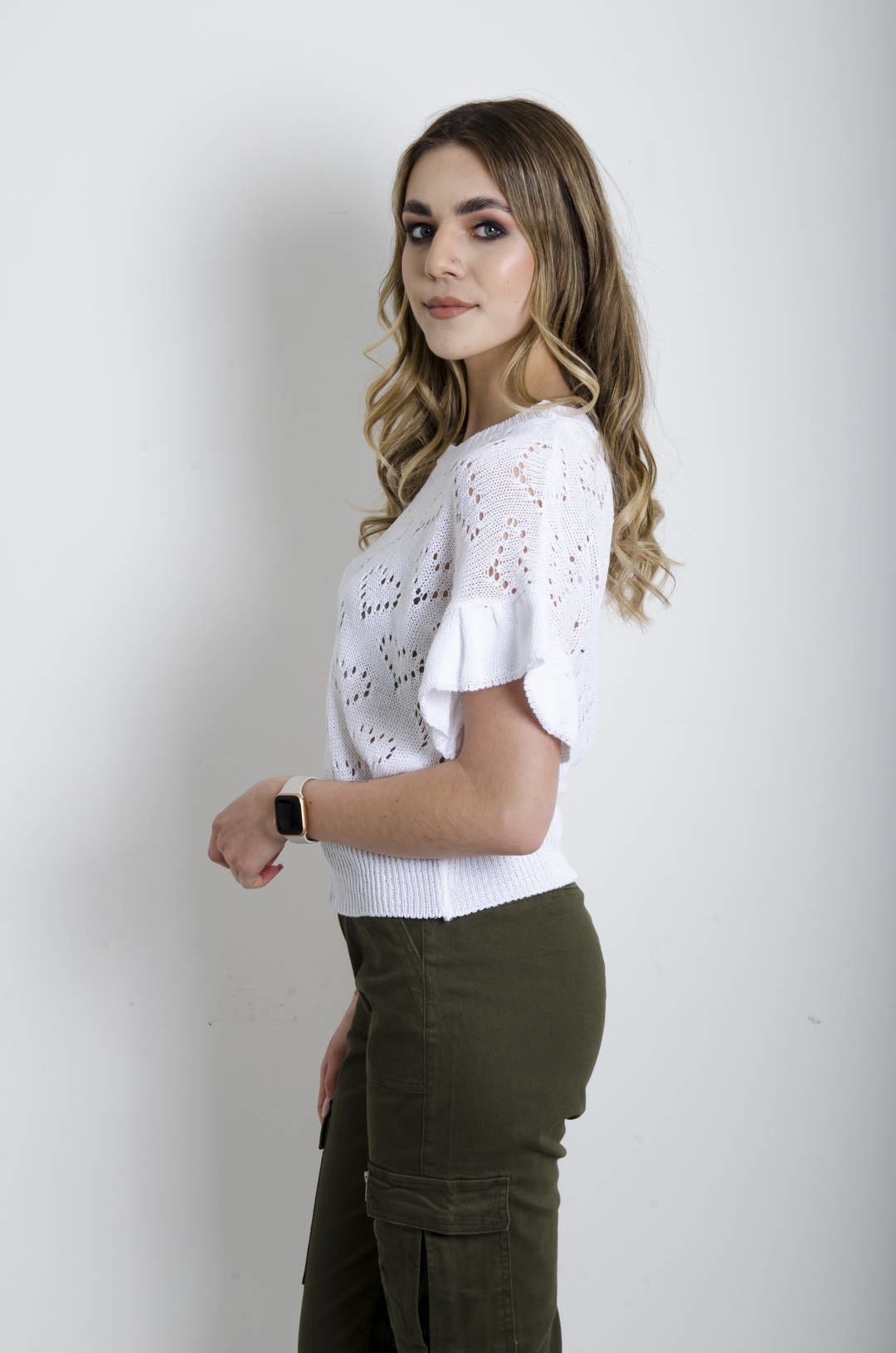 SWETEREK W SERDUSZKA AŻUROWY Z FALBANAMI PRZY RĘKAWACH- BIAŁY