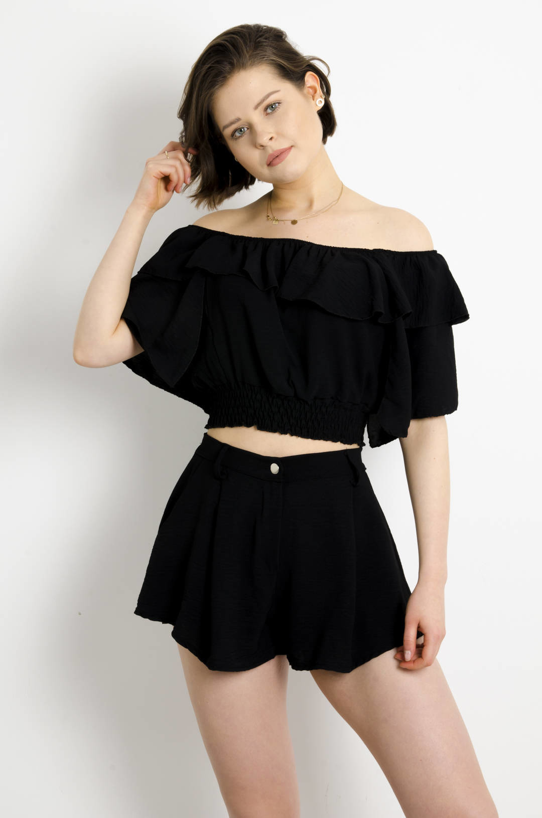 CZARNY KOMPLET HISZPANKA + SPODENKI Z WYSOKIM STANEM