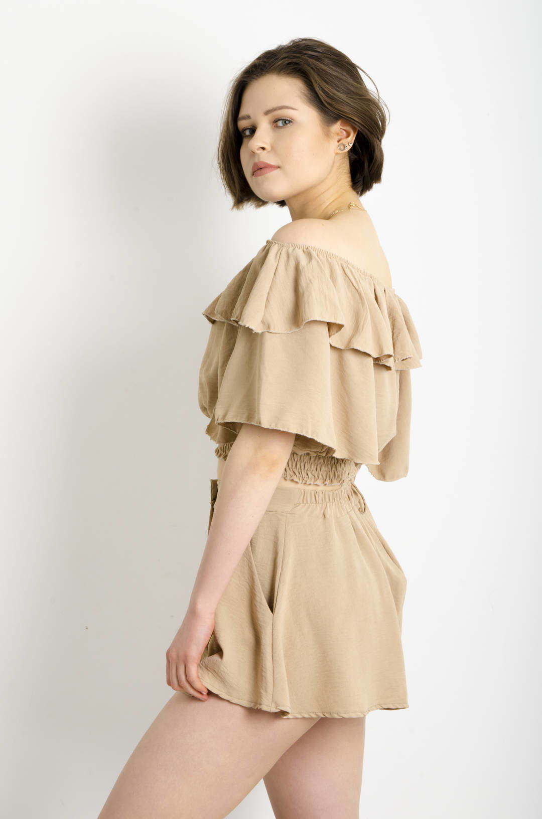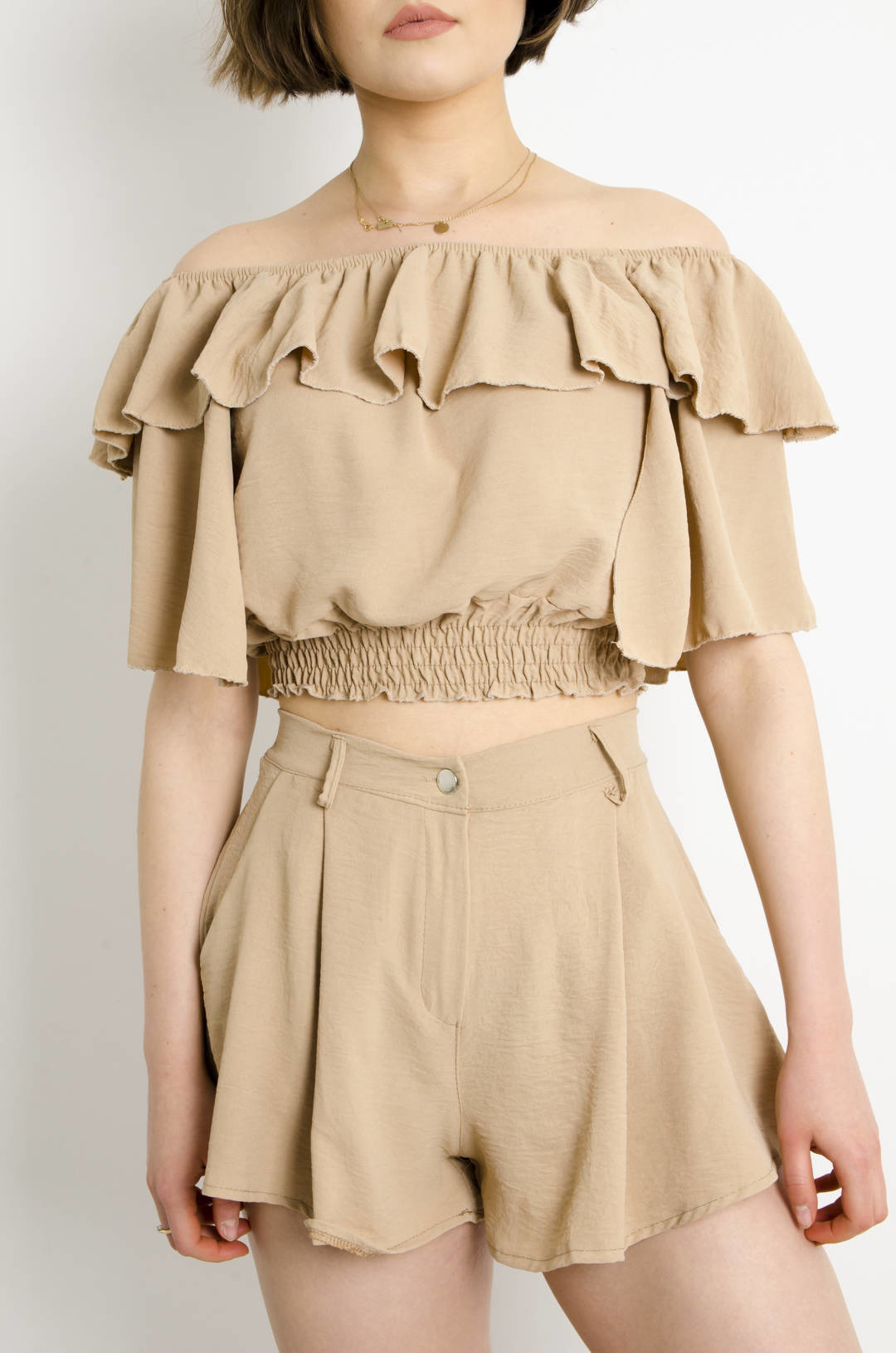 BEŻOWY KOMPLET HISZPANKA + SPODENKI Z WYSOKIM STANEM