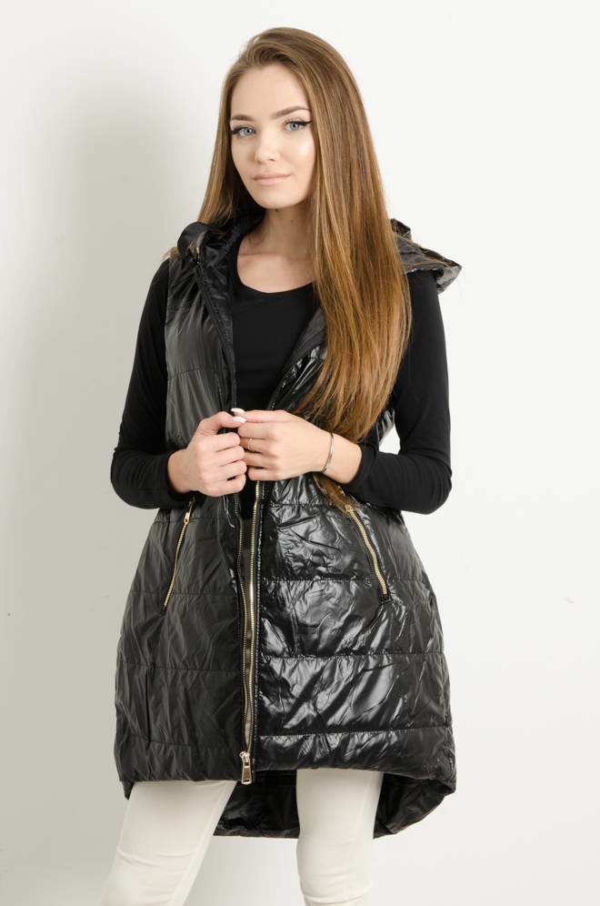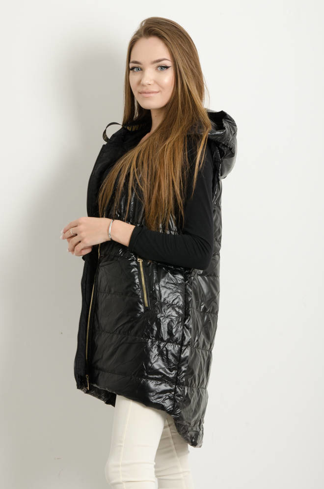 KAMIZELKA ASYMETRYCZNA Z KAPTUREM ŚCIĄGANA W PASIE- CZARNA