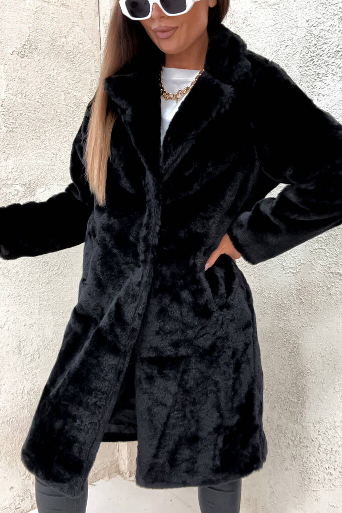 CZARNY FUTRZANY PŁASZCZ Z KIESZENIAMI