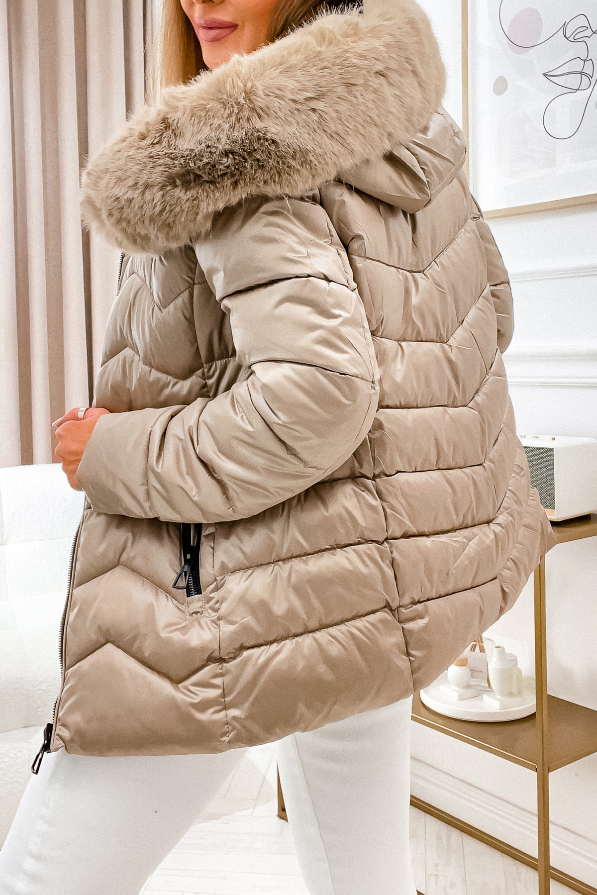 PIKOWANA POŁYSKUJĄCA KURTKA Z FUTERKIEM- BEŻOWA