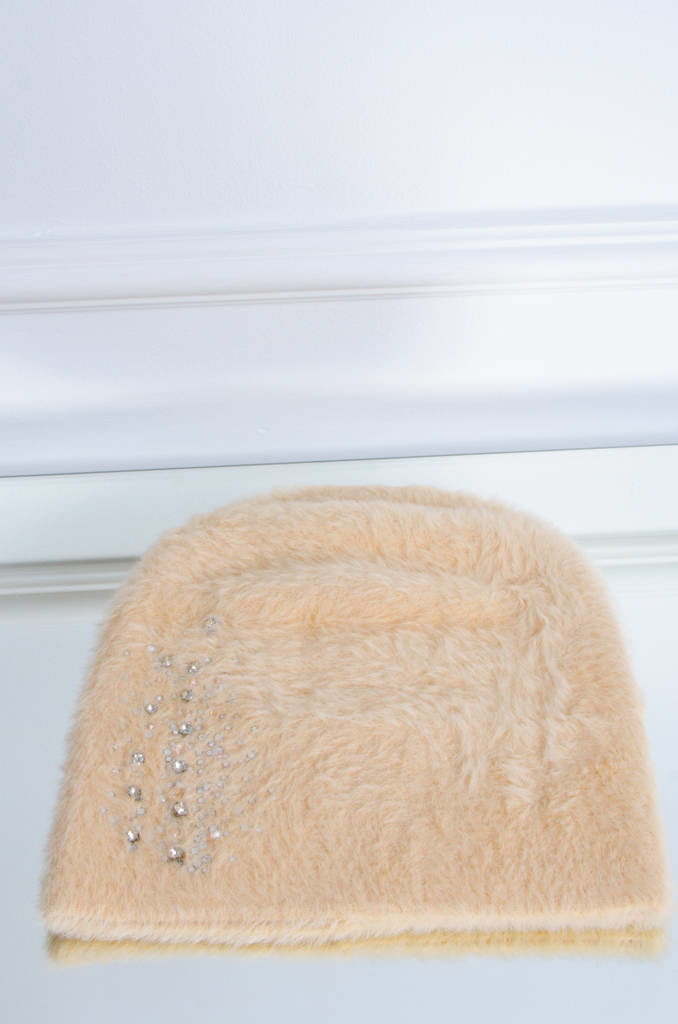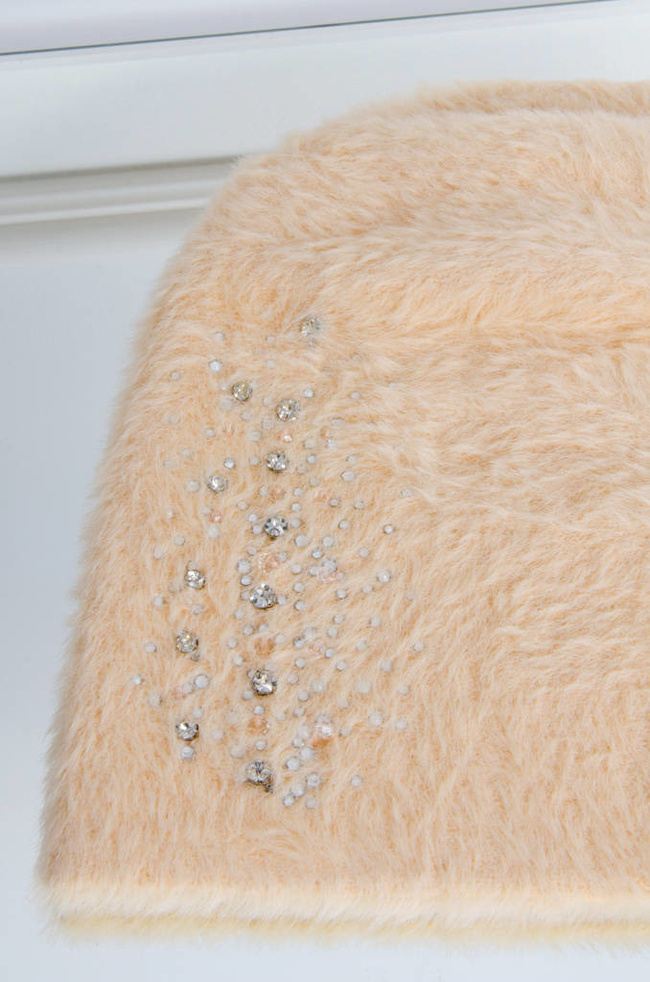 BEŻOWA FUTRZANA CZAPKA Z OZDOBNYMI KRYSZTAŁKAMI