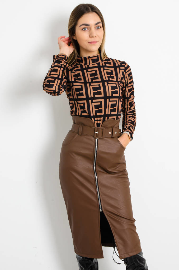 BRĄZOWA SPÓDNICA MIDI Z IMITACJI SKÓRY Z ROZCIĘCIEM+ PASEK
