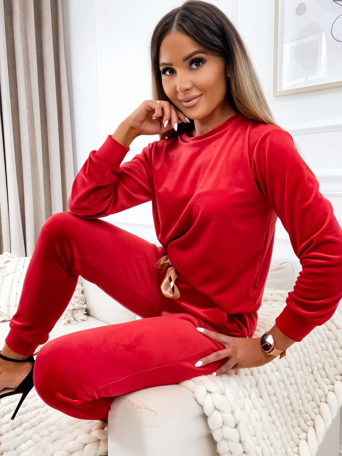 KOMPLET DRESOWY WELUROWY Z OZDOBNĄ NASZYWKĄ-  CZERWONY