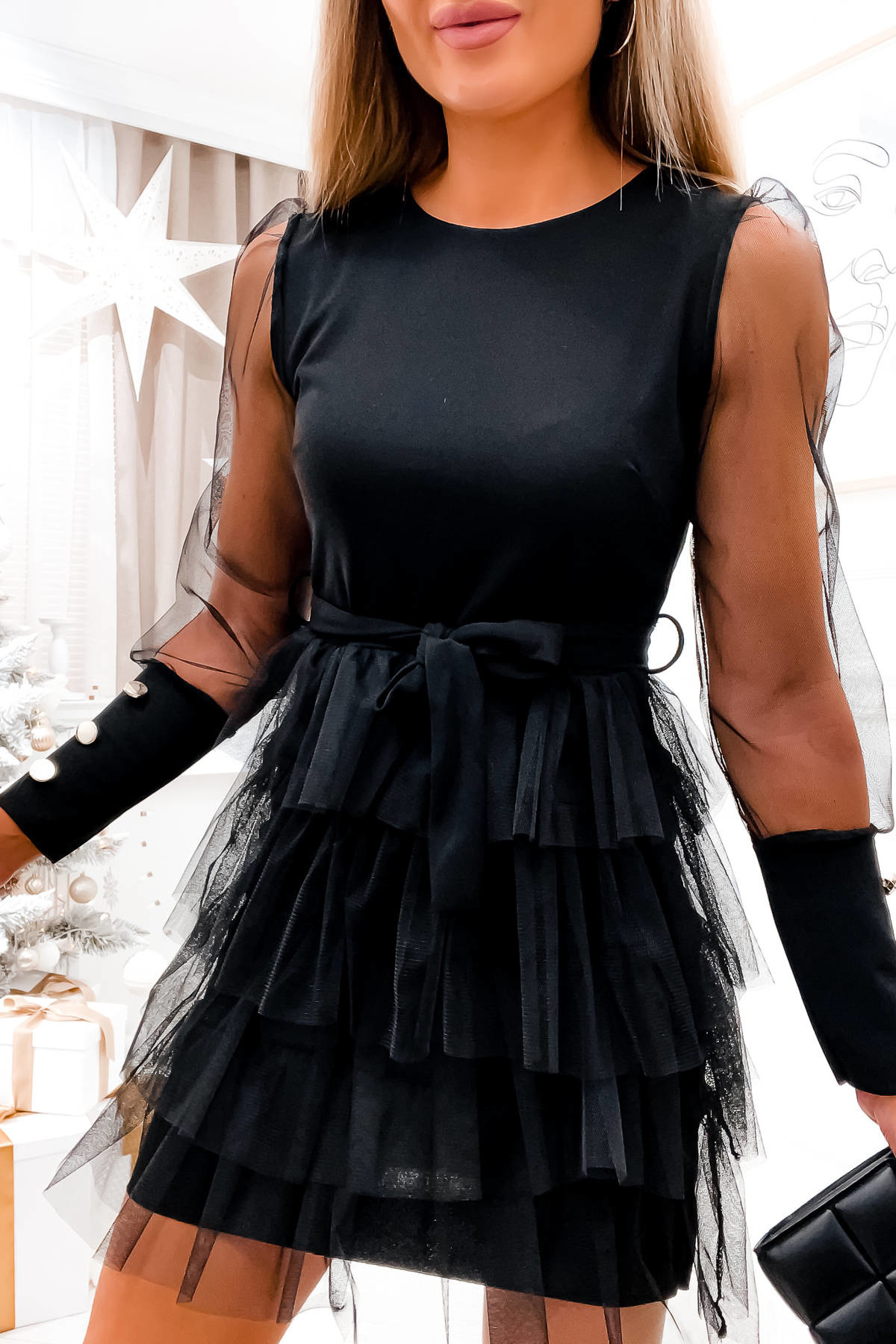 CZARNA SUKIENKA Z TIULOWYM DOŁEM I BUFIASTYMI RĘKAWAMI