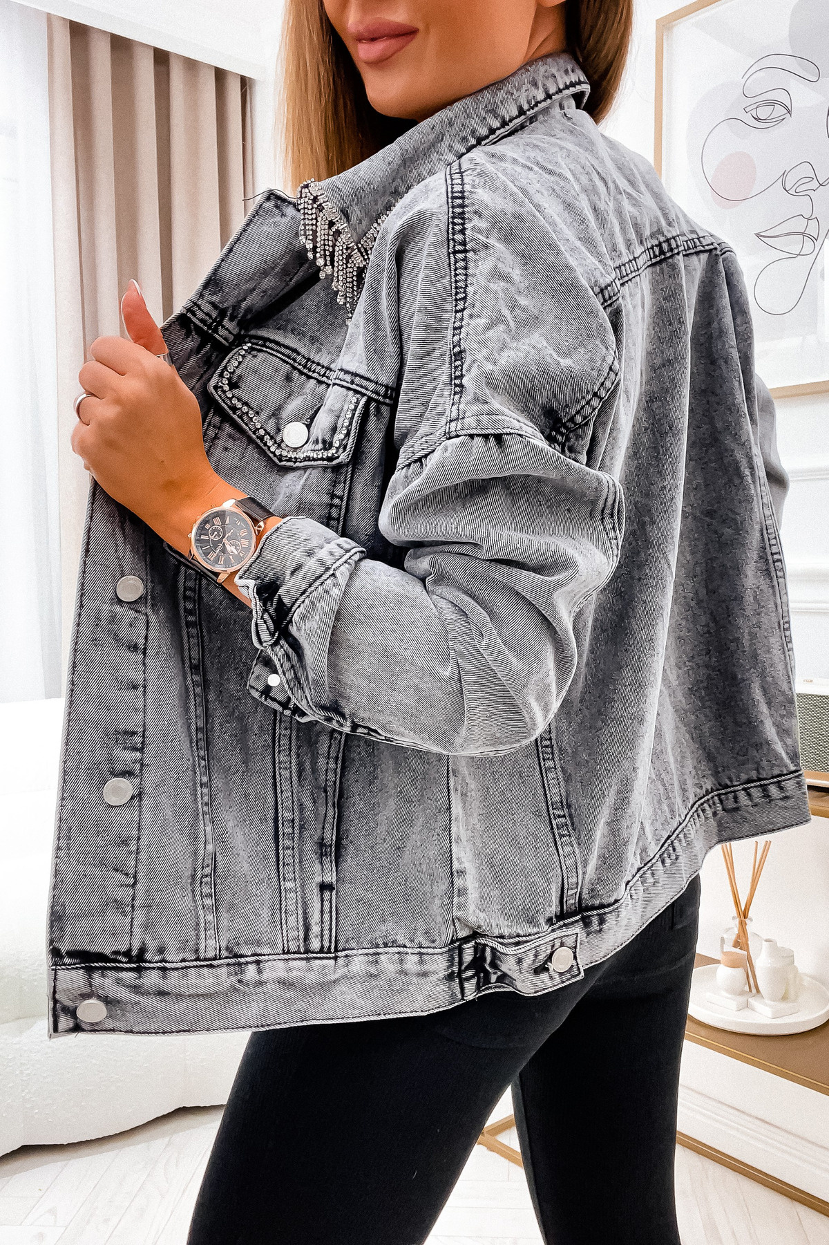 SZARA KURTKA JEANSOWA Z OZDOBNYM KOŁNIERZEM I KIESZENIAMI