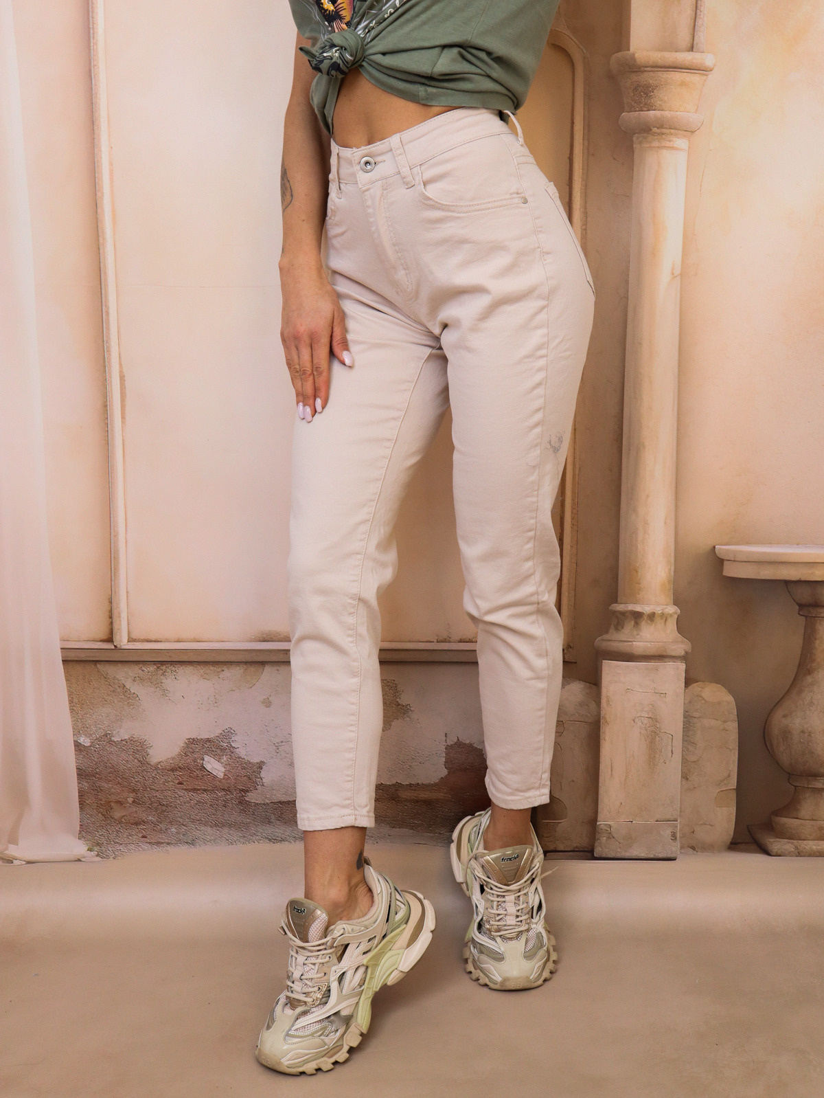 BEŻOWE MATERIAŁOWE SPODNIE- MOM FIT