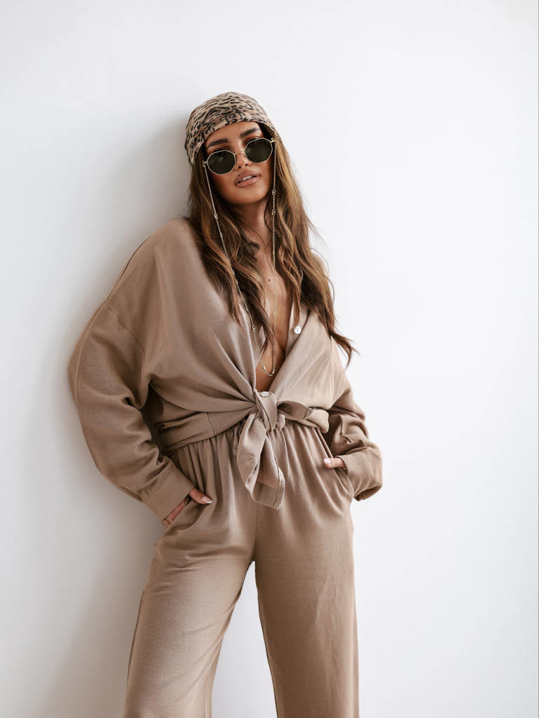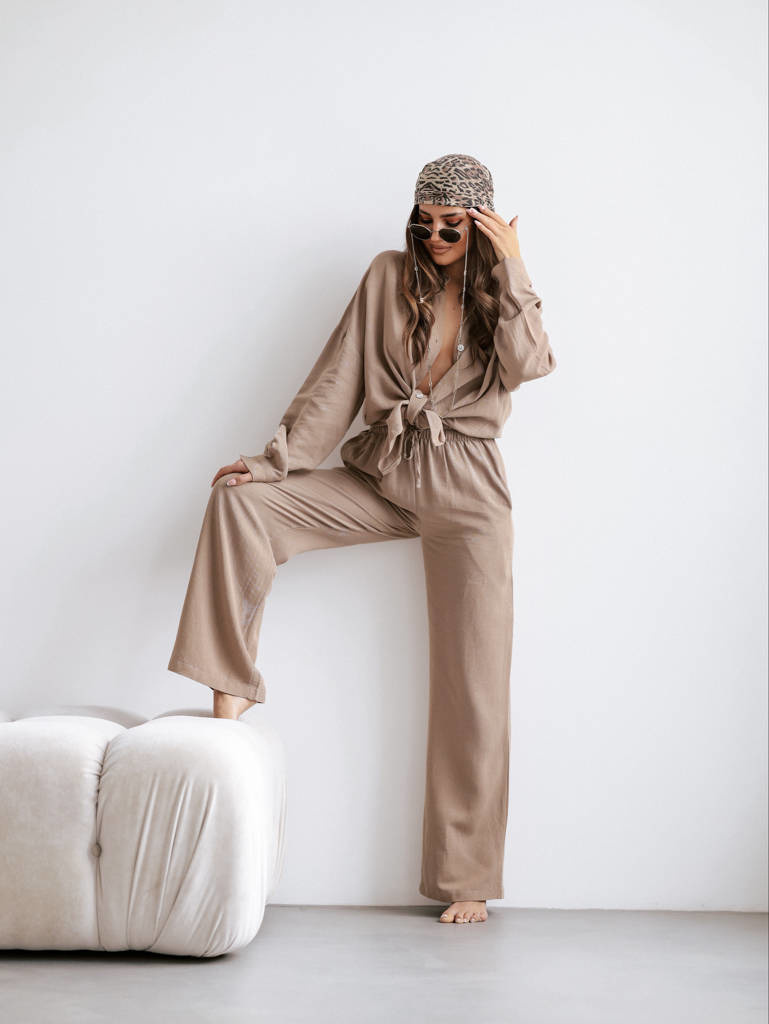LNIANY KOMPLET KOSZULA+ SPODNIE- BRĄZOWY