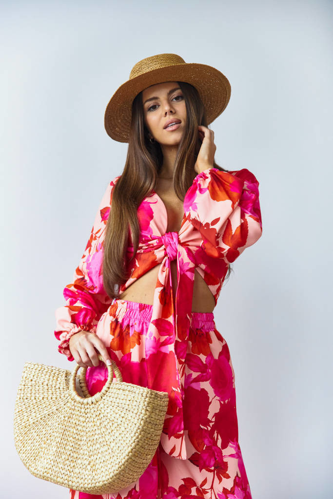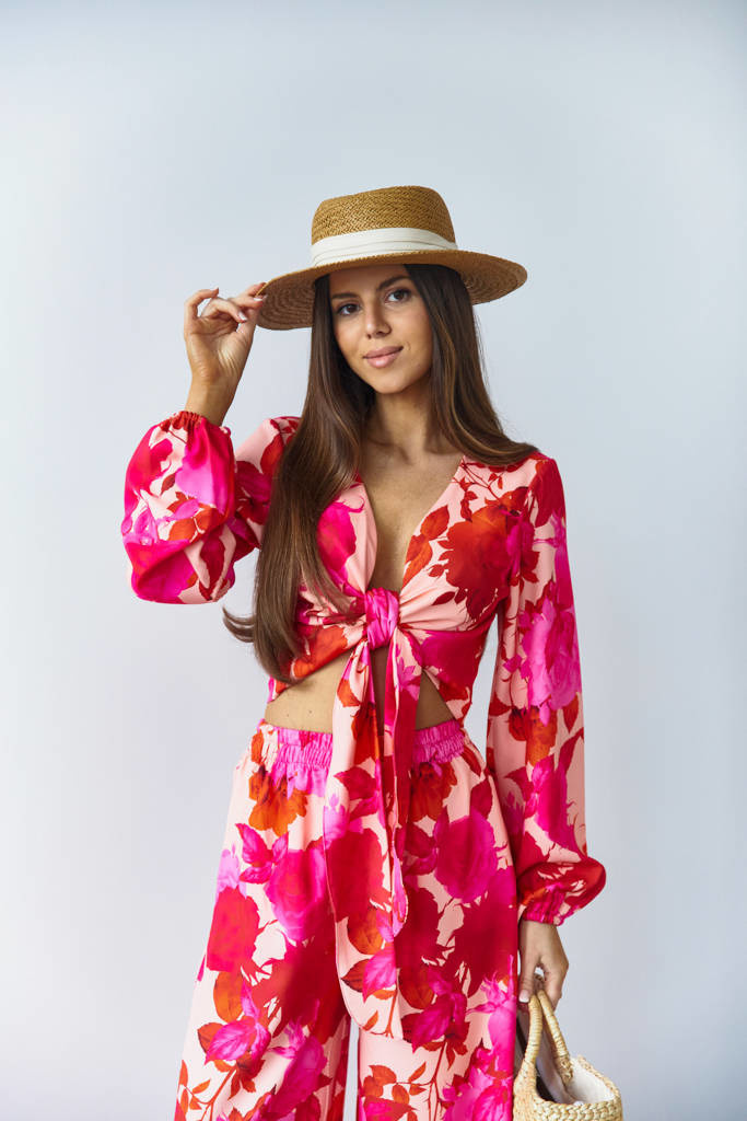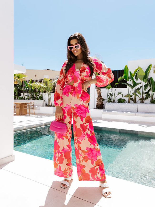KOMPLET W KWIATY SPODNIE+ BLUZKA- RÓŻOWY