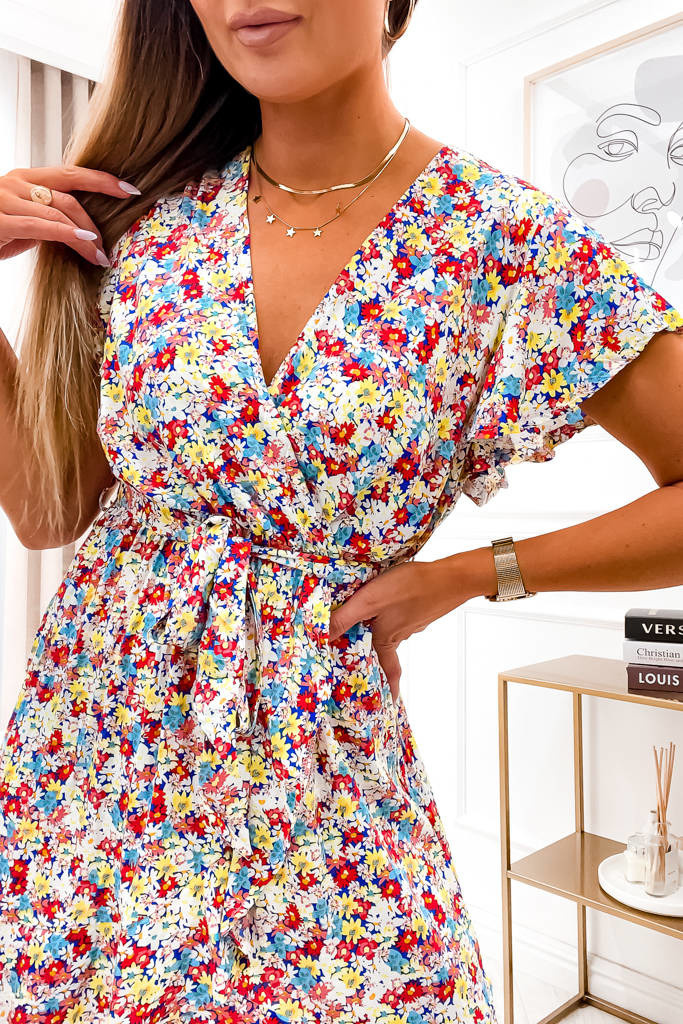 SUKIENKA NIEBIESKA MINI NA ZAKŁADKĘ Z WIĄZANIEM W PASIE I MOTYWEM KWIATOWYM