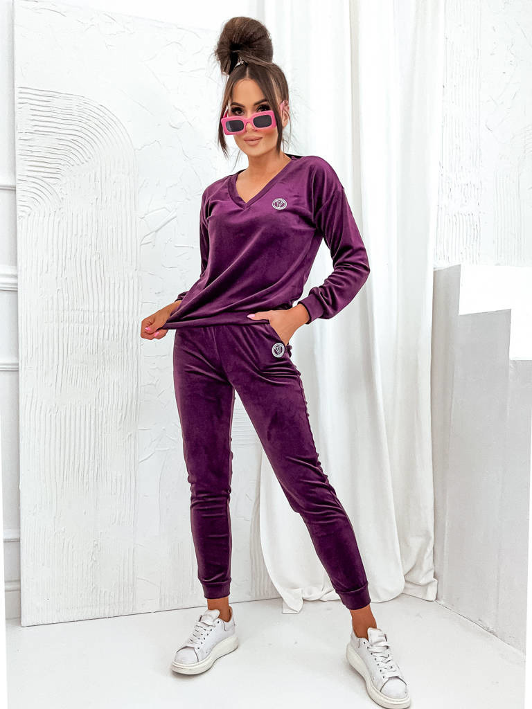 WELUROWY KOMPLET DRESOWY BLUZA W SZPIC + SPODNIE Z NASZYWKĄ- ŚLIWKOWY