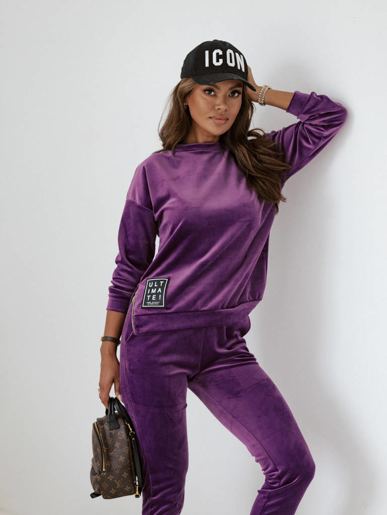 WELUROWY KOMPLET BLUZA Z ZAMKIEM I NASZYWKĄ + SPODNIE- FIOLETOWY