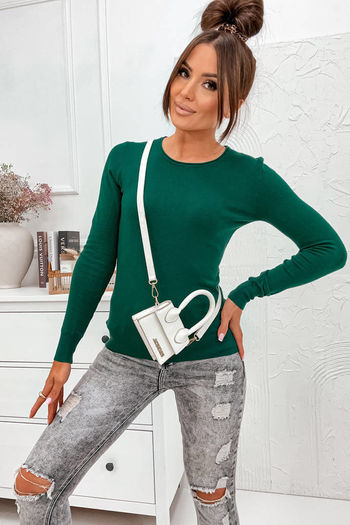 SWETEREK  ZE ŚCIAGACZAMI I OKRĄGŁYM DEKOLTEM - CIEMNO ZIELONY