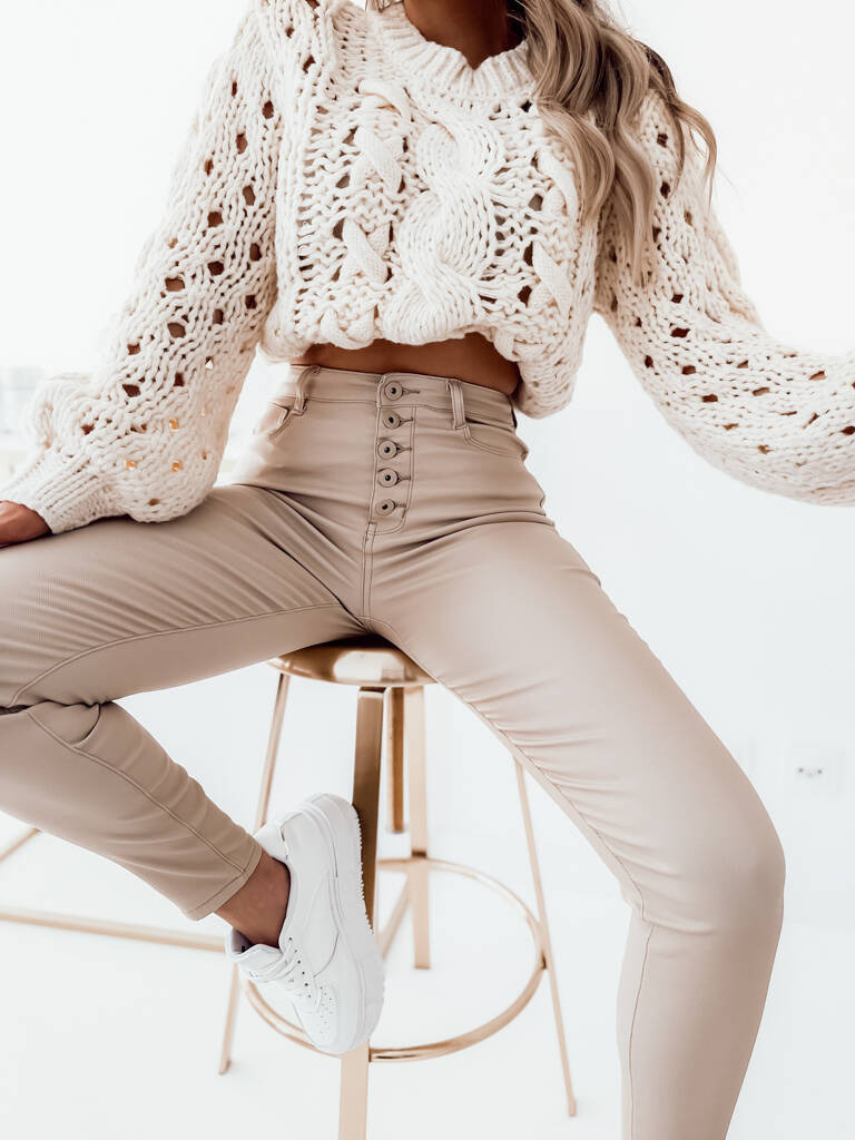 WOSKOWANE SPODNIE Z WYSOKIM STANEM I GUZIKAMI- BEŻOWY