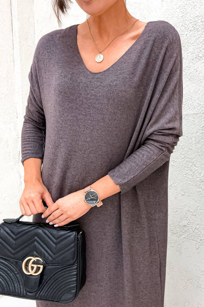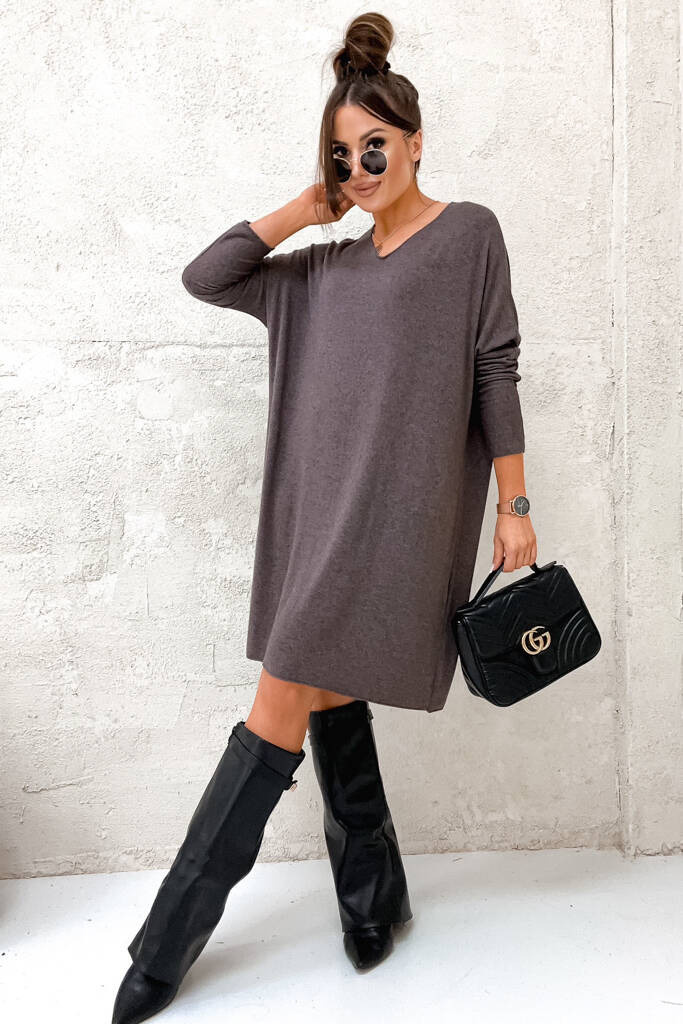 SUKIENKA MIDI OVERSIZE Z DEKOLTEM W SEREK- BRĄZOWA