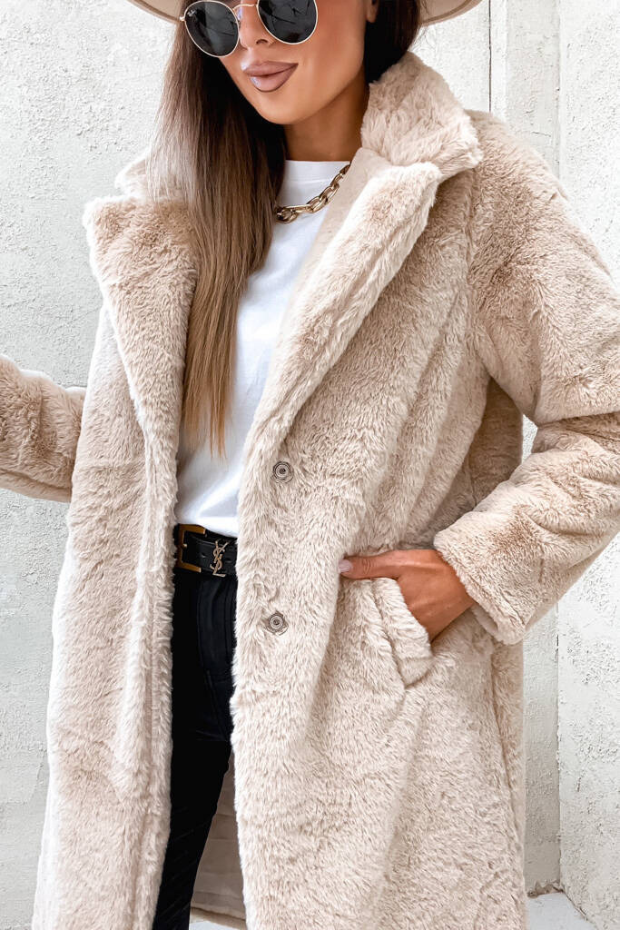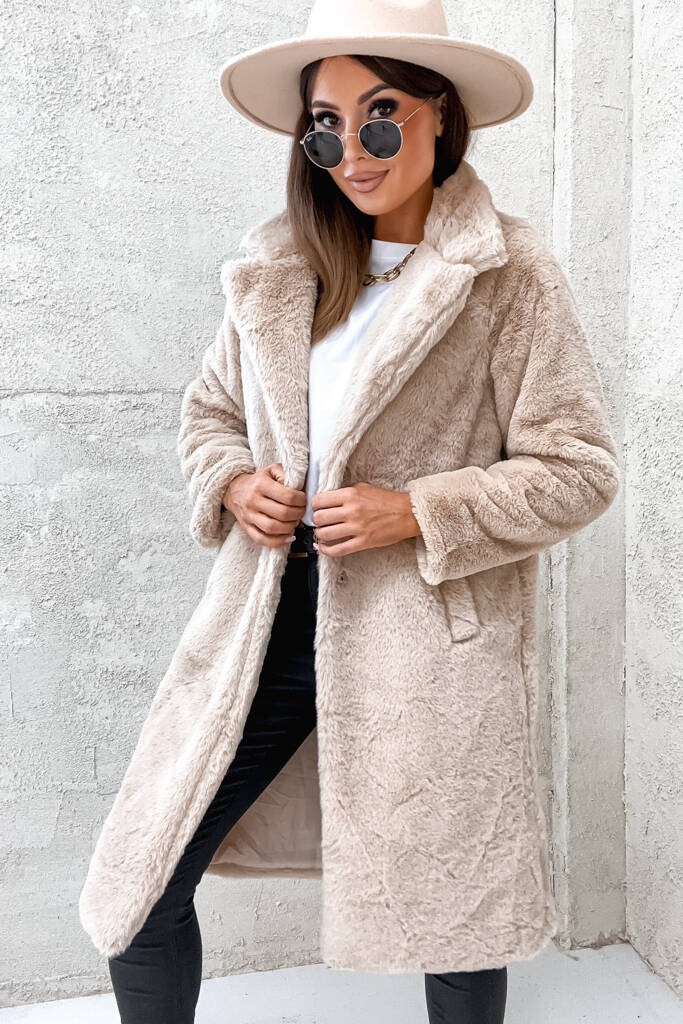 BEŻOWY FUTRZANY PŁASZCZ Z KIESZENIAMI