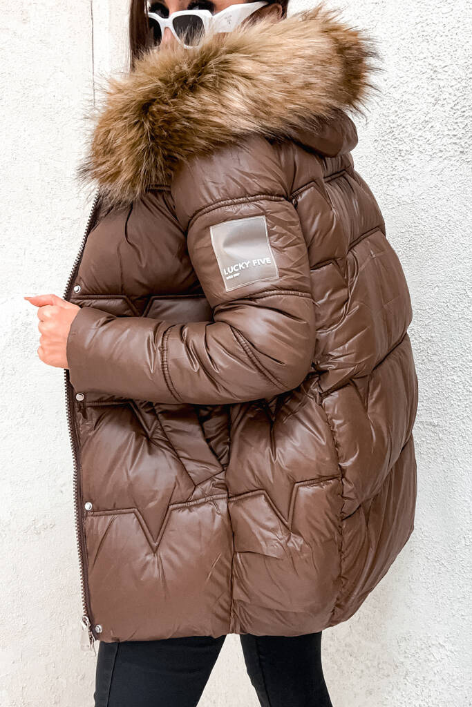 CIEMNO BRĄZOWA KURTKA PIKOWANA Z NASZYWKĄ NA RĘKAWIE