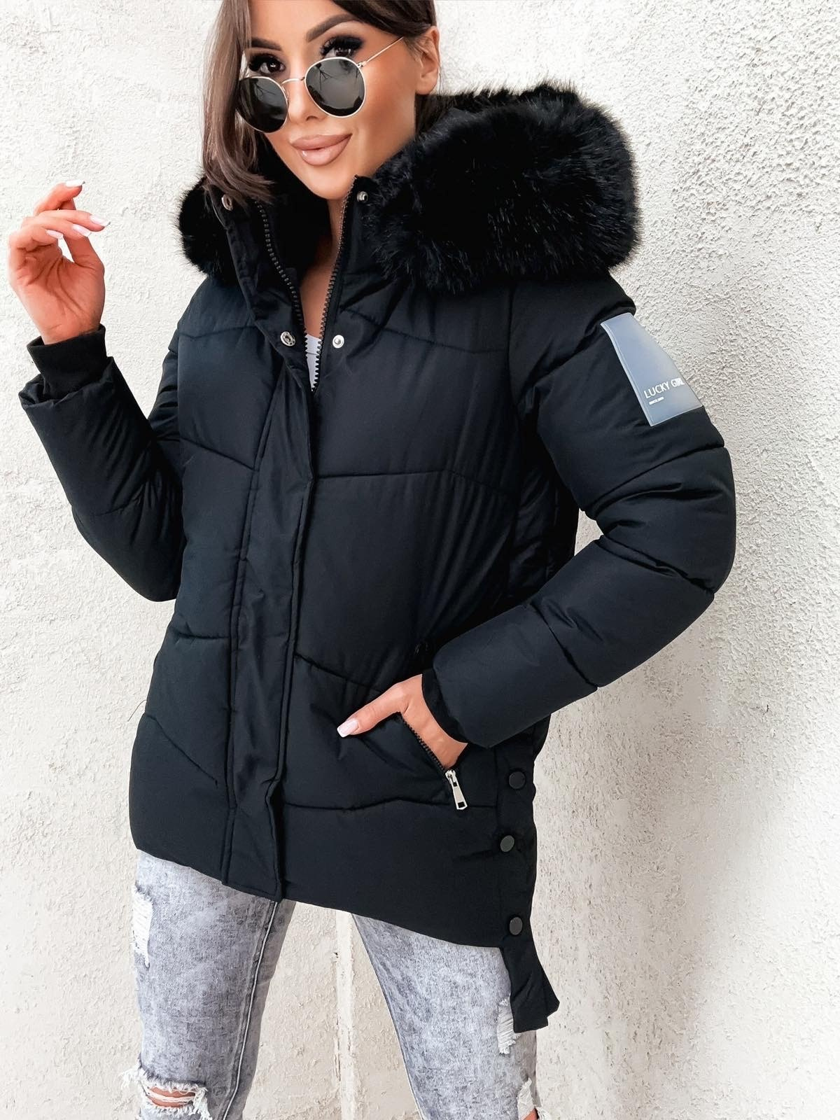 KURTKA Z NASZYWKĄ I LISEM NA KAPTURZE- CZARNA